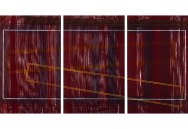 Impetuous, 2003–2004, is an overlay of exuberant brush strokes, undulating stripes and a series of open rectangles that appear to move within and across the canvas. Still No Hero Here, 2003 extends an earlier dialogue inspired in part by the abstract expressionist painter Clifford Still, in which transparent rectangles appear to float across fluid, fissured waves.