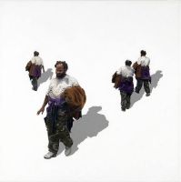 | Carol K. Brown, Pedestrian (63020), 2006 The people depicted in these paintings have become characters in an imaginary play. Against a stark white background, the intensely colored figures are replicated and arranged in groups according to Brown�s �manipulation�, thus creating relationships that never existed, but appear plausible, nonetheless. The artist explains: �As I wander streets I am often amazed at the delicious array of visuals amongst the �prosaic.� The angle of the observed and the observer is constantly shifting. By segregating, duplicating and changing scale of my subject, I am setting up hypothetical relationships, both physical and psychological. My anonymous subjects lie squarely within the realm of the public, but in their isolation, underscored by the intense shadows and ambiguous spaces, they give off very personal, private vibrations.�