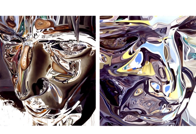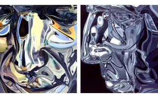 Installation view Hammelehle und Ahrens, 2005 His way of painting can be compared with the flat copying or imitating of the photo-realists. Painting becomes a variable game with colour and motif by means of a frame. Established parameters such as technical procedures, limitation to certain motifs and standardised formats, on which new motif cut-outs are tuned, make series possible where colours, structures and forms change in fine and hardly perceptible gradations. The same thing is always different and diversified. The sum of the parameters produce the style which has become typical for Jung. An artificial extract from reality is copied whose more or less abstract structures and processes are imitated and woven into something new, the object depicted. In order to best transfer or transform the seductive and polished aesthetics of shaped glass, metal and other materials and objects into the next medium, the picture, Jung uses photos, printed media and household utensils as models. | There are models for practically all pictures, including those whose shape and structure textures seem like pure inventions - colourful, shadow-casting of light or bright colour spots which seem to absorb ornamental linkages without depiction content out of their own rules. The painted picture frees itself from the model, whether a photo or a concrete object, and becomes independent of it. Abstraction arises from distortion. This is why Jung�s pictures move around in a zone between realism and abstraction. The definitive lies in seeing and in the surface, in the difference between object and picture, the non-hierarchical iconography of the mundane. - Giti Nourbakhsch in Cat. "Stephan Jung",Galerie Hammelehle und Ahrens, Stuttgart 1997 Images : Top left - Host #4, 2004, oil on canvas. 104 1/3 x 90 1/2 inches (265 x 230 cm) Top right - Host #2, 2003, oil on canvas, 104 1/3 x 90 1/2 inches (265 x 230 cm Left - Installation view, Hammelehle und Ahrens, 2005. Bottom left - Host #3, 2004, oil on canvas. 104 1/3 x 90 1/2 inches (265 x 230 cm) Bottom right - Host #1, 2003, oil on canvas. 104 1/3 x 90 1/2 inches (265 x 230 cm)
