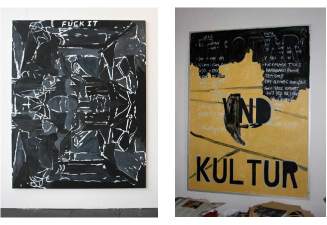Images from top: FUCK IT Tom Ellis, 2007 Oil and Acrylic on Canvas 2500H x 2000W JACTAR VND KULTUR Tom Ellis, 2006 Oil and Acrylic on found white board GONER Tom Ellis, 2006 Glass, paint wood Fucker in a Landscape Tom Ellis, 2007 Oil & Acrylic on canvas | But before you can slap yourself knowingly on the back, we�re back to dumb with a hastily painted self-portrait on a scrappy piece of sheet timber, which itself has been attached to sliding door mechanisms allowing the work to literally travel across the wall like some collapsing clown car. As we enter the main space, what appears, at first, to be a bizarre grouping of pseudo-modernist paintings, soon turn out to be the slacker musings of Ellis as he mixes purposefully dumb sentence construction with deconstructions of Picasso and Goya. These are again on sliders that turn the oversized paintings into doors or give them the option of somewhere to go, but too little room to move. This sounds like a clumsy metaphor for the many dead ends of painting, but in Klever Strasse, dumb is Klever, and if you are in any doubt as to how to wear your hang ups, Ellis has installed a German Beer Tisch for the audience to sit and contemplate, Tr�s Pass�, Fucker in a Landscape, The Lazy Thieving Cunt and of course, Fuck It.