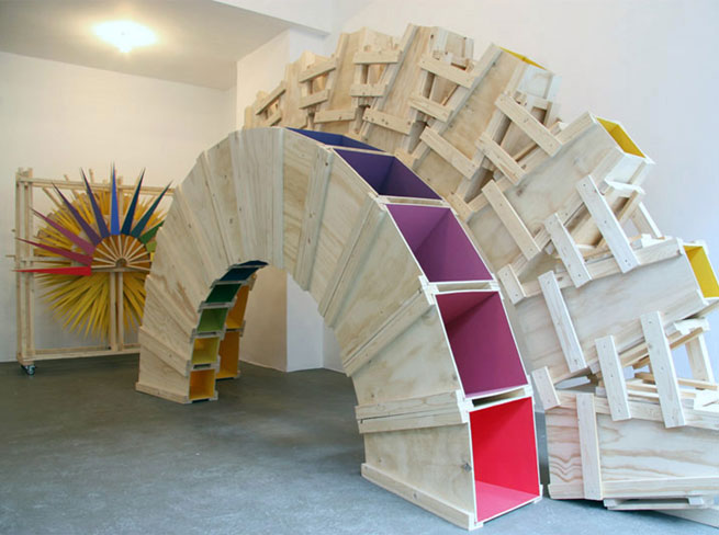 The fake, the future and the finite (A commemoration of the absolute in the 21st Century) Part 1: Sun, Rainbow, Arch, (reinvented), 2007 / 2008 Wood, acrylic, reels, 500 x 50 x 270 cm, 300 x 50 x 200 cm, 200 x 100 x 200 cm. Photo: Ariel Levin. Image � Alon Levin