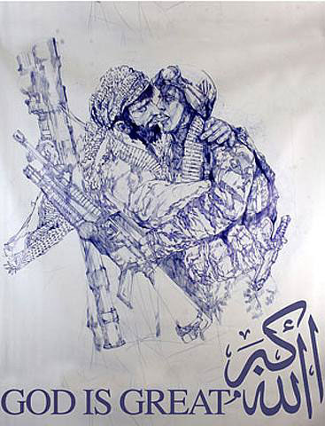 In the army, when not guarding things, begging for food or eating oil, Molodkin used to draw with his army-issue pens. “You kill your time,” he says. Sometimes he drew for himself, sometimes he drew in other soldiers' letters, for their parents or girlfriends. Only ever in blue. Even now, he only sketches in Biro. “Not Bic,” he says, amused at the thought of such luxury. “Russian Biro.” When not sculpting, most of his work is still Biro-based. In 2006 he produced a huge ballpoint drawing of George W. Bush entitled Empire at War. In making it, he used 2,764 pens, which, at the time, was the number of troops who had died in Iraq. On the inside of his wrist, he shows me a weird, bulging muscle that nobody else has. That's from using pens, he says, and cackles filthily, because some people assume it's from something else.