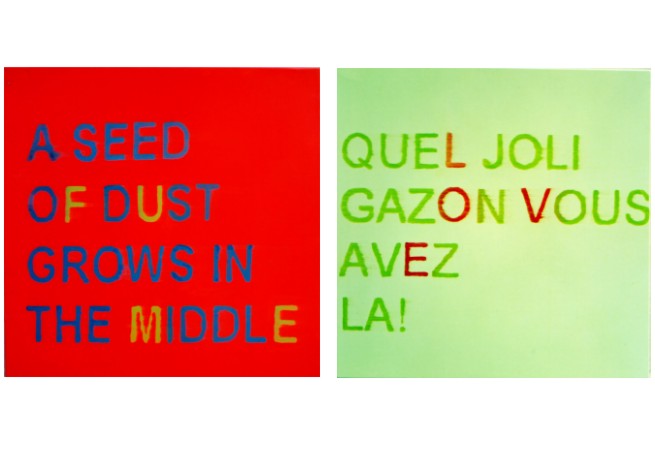 | My work is based on the use of texts in spaces, objects or on canvas. I have oscillated from one medium to another throughout the past five years. My exploration of typography and the projection of words onto surfaces has led to the consideration of text as a visual and playful substance. All work shown here are from my last series of paintings entitled Words and Colors. | ||||