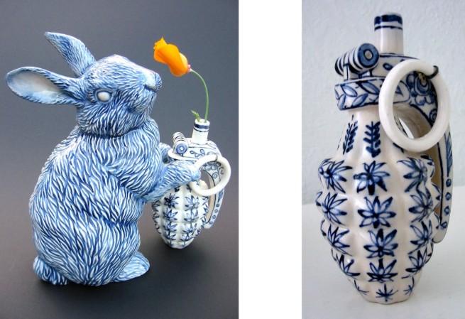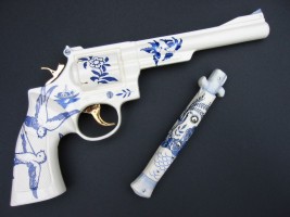 Krafft is an internationally recognized ceramicist and painter addressing the iconography of power through whimsical media. His humor jogs the viewer into a space of questioning where entertainment and critique collide.Quotes The New Yorker; “The show's standout is Charles Krafft's 'Porcelain War Museum Project', which recreates the side arms, pistols, and hand grenades of the Balkans conflict in delicate ceramics decorated in delft-style with faux-pastoral designs”POSTMODERN CERMICS says; “Krafft is one of the USA”s most sedittious artists, and plays difficult, uneasy games with content and culture”. Charles Krafft¹s life-sized porcelain firearms and grenades, decorated with traditional 17th century Dutch blue and white Delftware techniques have earned him a reputation as trickster, disarming a volatile instrument by making it fragile and beautiful. Included in the exhibition will be Hand Grenades, AK 47's, Smith & Wesson Revolvers and Intratec Semi-Automatics.