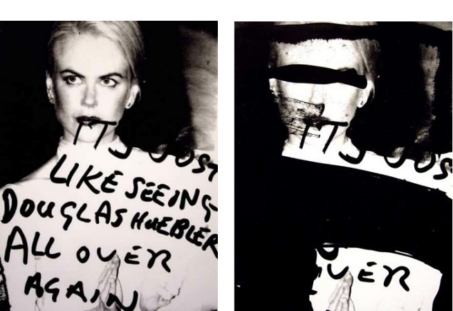 Images from Top: It's Just Like…, 2007 It's Just Like…, 2007 Untitled (Diver), 2007 Untitled, 2007 | Images are ripped from their original context and re-appropriated. Over these images Reid adds text, hand written in marker and ballpoint pen, often taken from films, the adverts or intuitive responses by the artist to the content of the original. Like Richard Prince, Reid re-photographs images, but her stance is far from passive and she is very much rooted in the tradition initiated by Valie Export or Elaine Sturtevant. She drags the apologies for culture by the hair and shouts in their faces until they present us with their true identity. She does to the pages of Hello what punk did to music and fashion, she holds up the banality and conformity of advertising and celebrity and shows the underlining aggression and sexuality hidden under the surface of these apparently subdued, but complicit images. Collaged elements, such as children's stickers and masking tape hover above the surface. Raw paint and marker are used to censor irrelevance often decapitating or denying the gaze. From the popular cultural media designed to control and feed the aspirations of the masses Reid presents, 'Life as you like it'.