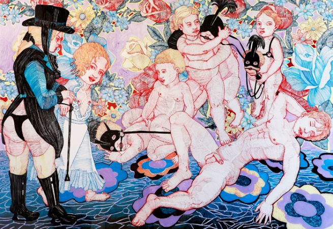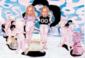 Renz’s previous works focus on young, almost prepubescent, girls in carnivalesque attire and ironically misogynist situations, “These young women are not unknowing Alice-like innocents, there is no ‘sugar and spice and all things nice’ to be appended to these Justines, Juliets or Lolitas…They challenge the stereotypes and male-dominated assumptions, the patriarchal constructions that men attempt to impose on women.”1 In Sub Rosa, Renz turns her focus to matriarchies and the private sphere. “In the private sphere, as opposed to the public sphere, power is more often exercised by women- the mothers or grandmothers. In modern families the father is becoming more and more absent leaving no one to control the female authority and allowing a shift of power from male to female and, inevitably, an abuse of power, but by the female.” In Renz’s latest series, the male subjects are shown in passive positions-sleeping in the nude, breast-feeding- but each work is imbibed with a sexualized undercurrent, bringing into question the roles of these female “nurturers”. | By reversing the gaze from female to male, Renz’s Sub Rosa is truly feminist in theory, although she also reveals the women as manipulators, exploiting and enjoying their position of power within the private family sphere. Top: Slumber 2007 Pigmentmarker and collage on paper 160 x 230 cms Left: Double 00, 2007 Pigmentmarker and collage on paper 62 x 43.2cms Below: Folie Fades, 2007 Pigmentmarker and collage on paper 62 x 43.2cms