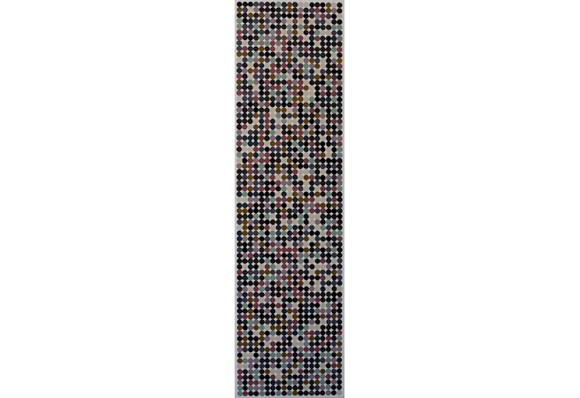 | #RichardSerra, Acrylic & Gesso on Canvas, 72×20 inches, 2015 This color portrait was created using 526 photos from Instagram tagged with #RichardSerra. The photos were combined and analyzed using software to compute the 10 most common colors in the photoset. The colors were distributed on the grid using a number system based on the cosine of 11 degrees. | ||||