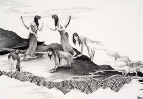 The compositional elements of the drawings reflect Vala's concern with a contemporary revisiting of ancient forms. Just as Isis' veil winds and twists, Vala's compositions trail down the paper, with perspective, scale and shadow losing their logical solidity. With a nod to Chinese scrolls, each piece posits a linear representation of the subject's life path through a successive series of struggles. Vala uses the Tibetan vajra-rock islands or cliffs (inverted pyramids upon which wrathful deities rest) as the stage for the girls' confrontations with their demons. Moreover, the intensity and gravity of the narrative are punctuated by the total absence of color throughout the exhibition.