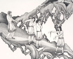 Although the tomes of The Tortuous Veil are preoccupied with power, violence and the shadow self, they tempered by the delicacy and sublime beauty of the drawings themselves. Hope and redemption are suggested within the narrative itself and by the graceful and detailed rendering. The exhibition also includes delicate paper sculptures of aspen trees and tombstones, emblems of fragility, impermanence and regeneration. Ultimately, this body of work is a striking neo-mythological exploration, exhibiting both rigorous artistry and allegorical inquiry.