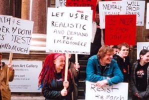 ‘Protest‘, in which people were invited to write a slogan of person protest on one of 200 blank placards, then march the streets en masse. The placards and a video of the march were exhibited afterwards. This piece was part of the 2003 Fierce Festival. – In 'Stare', Rogers maintained silent eye contact for 2 minutes with every visitor to the show. ‘Stare’ has taken place at Impressions Gallery (York), Custard Factory / Ikon Gallery (Birmingham), The Centre of Attention (London) and the DUMBO Art Center (New York). – 'Bad Motherfucker Is Watching You' is a video work in which a stern face, complete with teddy boy quiff and fake Stalin moustache, stares out from the screen. Occasionally he barks out orders. Part authoritarian Big Brother figure, part 70's porn star, he's a difficult character to work out. The resulting video piece was shown at The Royal College of Art (London) and York City Art Gallery.