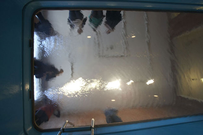 Erlich has constructed a full-size pool, complete with all its trappings, including a deck and a ladder. When approached from the first floor, visitors are confronted with a surreal scene: people, fully clothed, can be seen standing, walking, and breathing beneath the surface of the water. It is only when visitors enter the Duplex gallery from the basement that they recognize that the pool is empty, its construction a visual trick fashioned by the artist. A large, continuous piece of acrylic spans the pool and suspends water above it, creating the illusion of a standard swimming pool that is both disorienting and humorous.