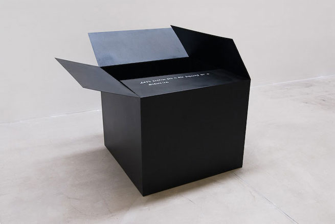1 – Table, 2008 writing on the work: This is a stainless steel table. At the left hand front corner of the table, a razor blade is stuck in a chewing gum on the table. On the table, there is a personal story carved on the tabletop with this razor blade. The story reads, “I have been living on my own for ten years now. Everyday, I get out of bed around noon. I leave my house at 1pm, Then I would spend the rest of the afternoon wandering around in the streets. I would always do one thing during this time. I would call my own phone number from a public telephone. No one is at home waiting for my call. I do that just for myself to see the number shown up in my phone when I go home late at night. I am so lonely.”