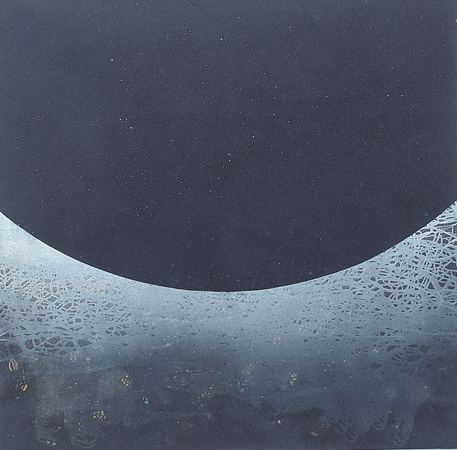 His oils on linen deal with the contrast between dark and light, space and edges. Compass, a monochromatic ellipse, might be read as a sacred eye, whilst also suggesting something of a medieval Mappa Mundi, created around a central sacred place such as Jerusalem or Rome. Although implicitly abstract, the physical world is never far away in these paintings; they suggest the expansive horizons of sea or the sky breaking from night into dawn. Light emanates from beyond the edge of a fecund semi-circle in Gaze (above), again suggesting the pupil of an eye or the edge of a planet revolving in deep space.