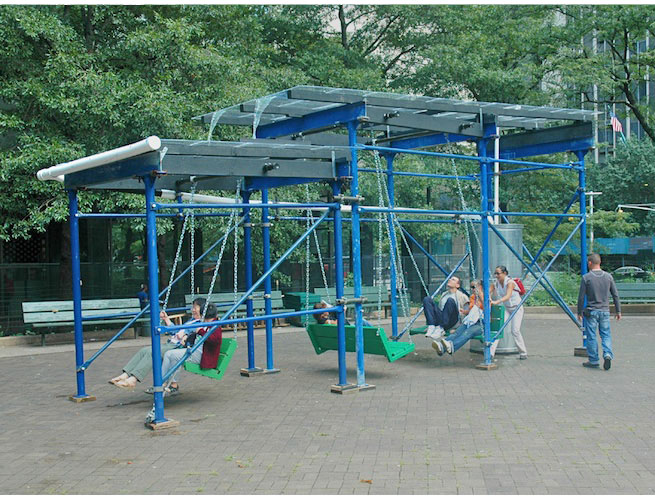 Description: Combining the archaic and the modern with an absurdist twist, the steel-and- Plexiglas structure provides shelter from its own inclement weather. A water tank sprays water onto a skylight incongruously mounted on a "sidewalk bridge," much like the ones that protect pedestrians at construction sites. The water runs across one roof, cascades down onto a lower roof, and into a gutter that leads to a drainpipe and back to the water tank. Inside the bridge hang several seats recalling both old-fashioned porch swings and traditional park benches, allowing up to eight people to sit and talk while rain splashes romantically on the skylight overhead.