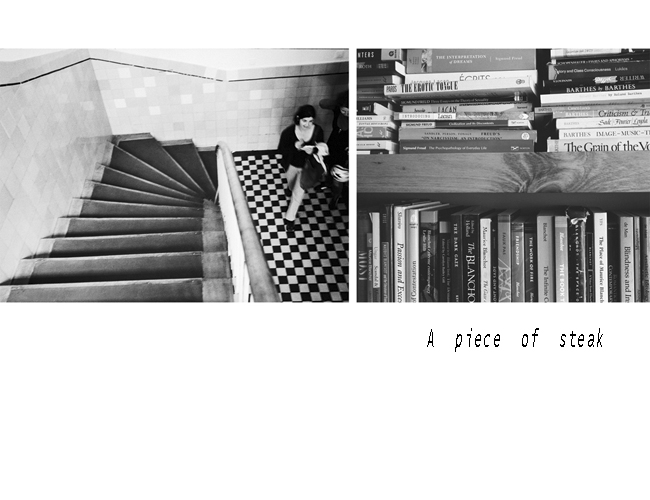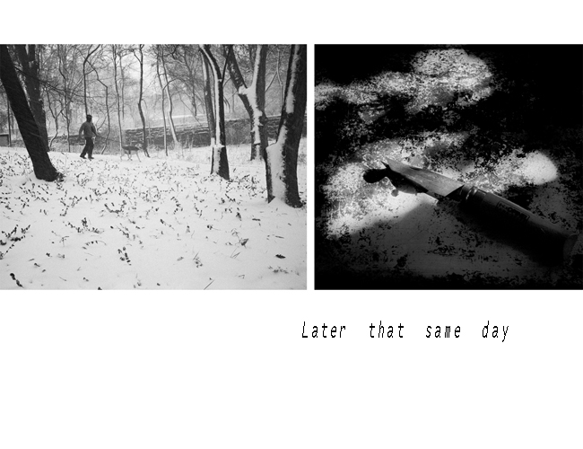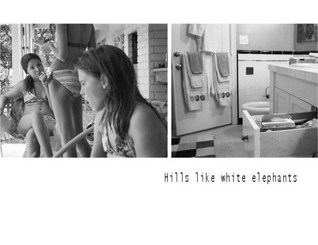 Then I constructed a second set of photographs with the intent of adding mystery and narrative direction to the first group. The first documentary photograph gets paired with a second constructed image. Each diptych elicits imagined relationships, encouraging the creation of narrative flow between the images. I have used titles of well-know short stories to bring another lever of narrative to the compositions. The titles, that work equally well for viewers who are familiar with the stories, as well as those who are not, sends the viewer in another narrative direction. This photographic and narrative fragmentation exposes the difficulty in identifying and differentiating between the factual and fictional, questioning our cultural definitions of both.