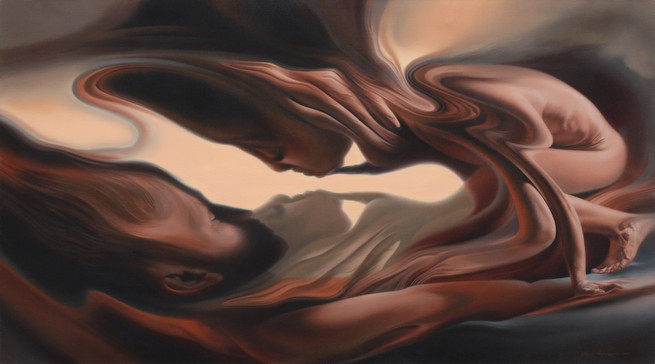 After completing the second painting from the series, I wrote a short story on the same topic. The story should have been an accompanying text. Bearing in mind that I have significantly altered my approach to the topic, the narration no more explains the paintings themselves, but reveals what the couple experienced out of the paintings.