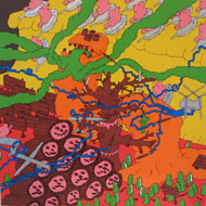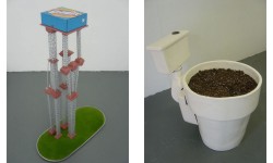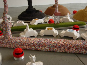 He uses drawings, paintings, sculpture, and video to transcribe small details from his memory into a whimsical aesthetic. His work mixes his absurd and sophisticated wit, with a subtle melancholy of memorial, but is executed with a touch of both the simplicity and cruelty of a child�s eye. - He assembles casts of taxidermist animals or toy train tracks into sculptures and structures that seem as though they are just about to topple over. The rigid materiality of household objects is transformed into illogical fantasies whose architecture is supple enough to allow the most unfathomable realities to seem at ease. - Touron is represented by SlingShot Project Gallery NY.