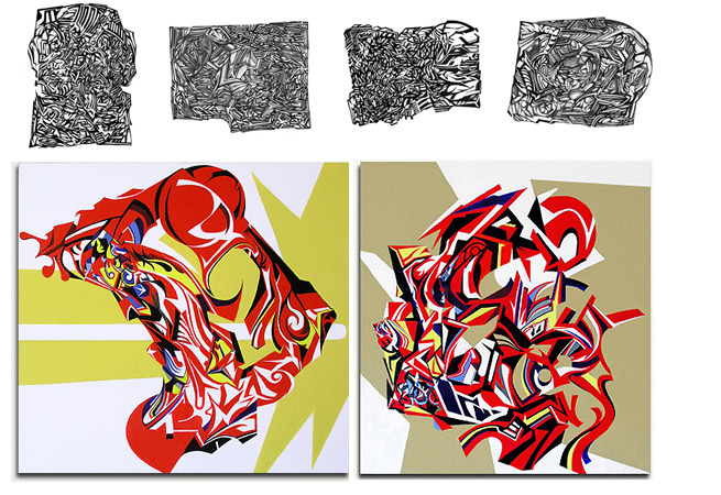 "Crush You" 2007 39 x 35 inches, acrylic on canvas. "What Would Nothing Be?" 2007 37 x 33 inches, acrylic on canvas.