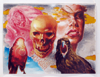 | In his paintings and drawings, Martinez captures the alienation of city life. Anger, loneliness, desire, rage, frustration haunt barren cityscapes in the form of totemic signs and symbols drawn from his urban environment. His images--drawn and painted with a skill rarely seen in contemporary art--are graffiti gang tags, ragged flaming Sacred Hearts, machine gun-toting fashionistas, demonic robot rabbits--the stuff of dead-end streets, abandoned warehouses, Botanicas, old comic books and magazines, faded tattoos and scarred skateboards. They are like a frame of double-exposed movie film, moments of absolute stillness and quiet, the city and its swirling chaos frozen for a moment, absolutely quiet, like the quiet of a coming storm. -Susanne Reece |