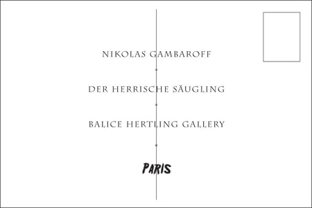 | NIKOLAS GAMBAROFF - DER HERRISCHE S�UGLING MAY 21 - JULY 30, 2011 VERNISSAGE - PRIVATE VIEW: SATURDAY MAY 21st 6-9 PM BALICE HERTLING 47 RUE RAMPONEAU 75020 PARIS M. BELLEVILLE T +33 (0)1 40 33 47 26 F +33 (0)1 40 33 47 36 | ||||