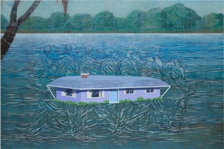 | Jim Shaw November 1 - December 21, 2013 Opening reception: Friday, November 1, 6 - 8 pm Blum & Poe is very pleased to present our first solo exhibition with Los Angeles based artist Jim Shaw. Spanning three decades and covering the entire gallery, Shaw's fantastical, humorous, and psychologically laden explorations into esoteric, as well as popular, cultural phenomena coalesce to render a tale of Biblical proportion. Combing historic texts, artworks, comic books, and his dreams, Shaw's flood of imagery is an essential tool in conveying his imagined histories and fables. Rivers, houses, and hair are but a few motifs repeated throughout the exhibition. Seemingly disparate, they mnemonically serve each other in depicting over-arching themes of fallen heroes, collapsed economies, concepts of sin, and general doomsday destruction. No human transition is more extreme than life to death, which Shaw makes prominent in his repetition of ominous water motifs. Enveloping the exhibition space at eighteen by forty feet is the work Mississippi River Mural, an old theater backdrop layered with a frieze of figures painted in illustrative comic style in battle-ready stances. This commanding work is unnervingly static, as if the figures have waited an eternity for their stage queue to the afterlife. Shaw's obsession with the cycle of life and death serves as a basis for the other works in the show. Playing central roles throughout the exhibition are two operas: Wagner's The Ring of the Niebelung and Brecht / Weill's,The Seven Deadly Sins. Each depicts the lust for earthly objects as the ultimate downfall of man. Shaw's painting The House in Mississippi illustrates this damning quest quite literally with a coffin, in the guise of a home, being carried down the river by seven pall-bearers. Once acquired, the home becomes a burden, trapping the one who sought it. Directly across from this work is a house composed of hair. In this example, hair becomes a binding, tentacle-like force, entangling man in his own selfish pursuit. Shaw's concern with the sin of man is cast in a broad range of spiritual fanaticisms. References to Evangelicalism, Blakean mysticism, as well as his own fabricated pseudo-religion, Oism, shift the conversation from one of high art to populist agendas. In this vein, Shaw has created a banner similar in style to Evangelical tent revival murals, which crosses Biblical, Eschatalogical, and Oist histories. Stemming from a place of self-reflection, these often grandiose gestures are marked with a sense of vulnerability. Alchemically fusing the high and low, Shaw's capacity to produce a body of work that reveres the human condition, in all its extremes, remains unmatched. Jim Shaw (born 1952 in Midland, Michigan) lives and works in Los Angeles. He received his bachelor of arts from the University of Michigan, Ann Arbor and his master of fine arts at California Institute of the Arts. His work has been shown extensively and has been the subject of numerous solo exhibitions, including a career retrospective at the Baltic Centre for Contemporary Art, Gateshead, UK; CAPC, Musee de'Art Contemporain de Bordeaux, France; MoMA PS1 Contemporary Art Center, Long Island City, NY; Magasin, Centre National d'Art Contemporain, Grenoble, France; ICA, London; and Musee d'Art Moderne et Contemporain, Geneva, Switzerland. Shaw is currently exhibiting Encyclopedic Palace 55th Venice Biennale, Venice, Italy; Museum Boijmans van Beuningen, Rotterdam, Netherlands; and the Chalet Society, Paris, France. His work is also featured in prominent public and private collections, such as MoMA, New York; Solomon R. Guggenheim Museum, New York; Los Angeles County Museum of Art; and Walker Art Center, Minneapolis, MN. | ||||