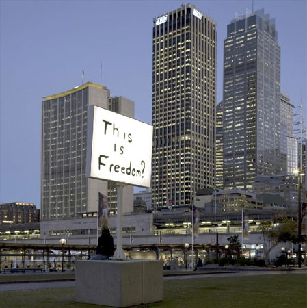 | Sam Durant This Is Freedom? April 11 � May 16, 2009 Opening reception: Saturday, April 11th, 6 � 8 pm Blum & Poe is pleased to announce This Is Freedom?, an exhibition of recent work by Los Angeles based artist Sam Durant. This exhibition will present a new body of Durant�s light box signs and drawings. Looping back on one another, the drawings serve as personalized indexes for the light boxes by illustrating their origins in archive photographs from Aboriginal civil rights protests in Australia and African American and Native American civil rights protests in the United States. The light boxes recontextualize the handmade protest signs found in the photos into the glowing language of commercial signage, their impassioned words now super-sized and immortalized, albeit codified. Durant often investigates social, historical, and political issues through sculpture, installation, photography, and drawing. He incorporates text and language that is imbued with these histories to find how the meaning is constructed and understood in society. These new signs were originally exhibited at the Sydney Biennial last year and expand on his previous signs, which drew from American civil rights demonstrations. This body highlights the parallels between US and Australian history with their shared colonial past and their oppressed Indigenous populations, and ultimately explores how historical moments can be reinstated, not only positioning one to reflect on the past, but to also to provoke a reinterpretation, and to consider the relevance in the present. Sam Durant was born in Seattle, and lives and works in Los Angeles. Durant has had several one-person exhibitions, a selection of institutions include the Museum of Contemporary Art, Los Angeles; the Kunstverein D�sseldorf; the Walker Art Center, Minneapolis, MN; and the Wadsworth Atheneum Museum of Art, Hartford, CT. His work has been included in such group exhibitions as the California Biennial at the Orange County Museum of Art, California (2008); Biennale of Sydney, Sydney, Australia (2008); 8 Bienal de Arte de Panam�, 8th Panama Biennial, Panama (2008); Freedom at the Hague Sculpture Center in the Netherlands (2008); Unmonumental at the New Museum, New York (2007); the 2004 Whitney Museum of American Art Biennial, New York; and the 2002 Venice Biennale, Italy. This Is Freedom? marks Durant�s eighth solo exhibition at Blum & Poe. | ||||