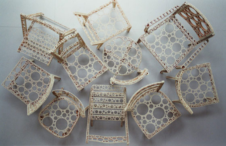 Carmen Perrin Espace �ponge - Schwamm oder der por�se Raum 2008, Installation mit rund 10 perforierten Holzst�hlen, einzeln erh�ltlich | |||