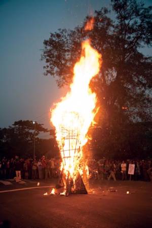 | Live True Life or Die Trying Naeem Mohaiemen Curated by DJ Spooky September 10 - October 31, 2009 Opening reception, Thursday, September 10, 6-8pm Discussion, Thursday, September 17th, 7 pm Mohaiemen in conversation with Vijay Prashad, author of Darker Nations: A People's History Of The Third World and Everybody Was Kung Fu Fighting: Afro-Asian Connections and the Myth of Cultural Purity. Related projects - http://shobak.org Informed by two Chris Marker films that are decades apart in political exhaustion, Grin Without A Cat (grand disillusion with interlinked global left revolutions) and Case of the Grinning Cat (anti-war movement with foretold conclusion), Naeem applies these polarities to political movements that he participates in or documents. Looking at a single day in January 2009, he follows two political rallies that happen in two parts of Dhaka. The first by a new group of young Islamists-- an event where he finds no familiar faces, "except among the photographers". Yet he also notes the energy: "These are not the Islamists we lazily lampooned in the 1980s. Now their rhetoric has a sharp edge and reality tint. When they argue that gangster capitalism has failed and is dragging down the world, that the global compact is imploding, it's a resonant message for many." The second rally, later in the afternoon, organized by a group of Leftists on the university campus. In this one, Naeem is back in his comfort zone, meeting familiar friends, joining in enthusiastically, sometimes marching and chanting, sometimes walking backwards trying to capture a "dramatic" photo. Through it all though, a queasy feeling: of the awareness that this second rally is so much smaller, of the inevitability of Left decline, of recognizing his own desire to zoom in for a close shot. The better to inflate the size of the crowd. His camera is soaked in bias and sympathy. Naeem Mohaiemen is a writer & artist working in Dhaka & New York. He uses text, video, and photography to explore historic markers in post-partition South Asia. He founded Visible Collective, whose projects http://disappearedinamerica.org looked at globally interlinked national security panic. Naeem also works on activist projects in Bangladesh. He writes the chapter on religious and ethnic minorities in the Ain Salish Kendro Annual Human Rights report http://askbd.org, as well as being a member of local activist networks http://unheardvoice.net/blog. Working between two countries, this work delineates the contradictions between Bengalis in marginal migrant status in Northern countries, and majoritarian (and authoritarian) status inside Bangladesh. His essays include Collectives in Atomised Time (with Doug Ashford, Idensitat), Fear of a Muslim Planet: Islamic Roots of Hip-Hop (Sound Unbound, DJ Spooky ed., MIT Press; runner-up for Villem Flusser Theory Award), Mujtoba Ali: Amphibian Man (The Rest of Now, Rana Dasgupta ed., Manifesta 7, Trentino), Everybody Wants To Be Singapore (The Good Life, Carlos Motta, Art in General), Adman Blues Become Artist Liberation (Indian Highway, Hans Ulrich Obrist & Julia Peyton-Jones, Serpentine Gallery), Beirut: Illusion of a Silver Porsche (Men of Global South, Adam Jones ed., Zed Books), and Why Mahmud Can't be a Pilot (Nobody Passes, Matt Bernstein ed., Seal Press), etc. Live True Life or Die Trying at Cue Art Foundation is Naeem's first solo show in America. Supported in part by Rhizome, Franklin Furnace and New Museum's "New Silent Series". This is part of a longer exploration of underground left movements, a Creative Capital project. Adiwit Ansathammarat Curated by Kay Rosen September 10 � October 31, 2009 Opening reception Thursday, September 10, 6:00 � 8:00pm �Adi�s feet are planted not so much in the past versus present, or Asia versus North America, but rather in a zone somewhere in between where memory, dreams and fantasy bleed together. Filtered through the fine mesh of his personal sensibility, a diary emerges in the form of painting or sculpture about loss, time, distance, and even humor.� �Kay Rosen Pangs of longing and the bleat of raw memory reverberate across the canvasses and scuptural surfaces of artist, Adiwit Ansathammarat. Born and raised in Thailand and educated in Scotland and Chicago, Ansathammarat is well versed in the painful and arduous process of leaving one�s home, culture and family. It is through these experiences that his work examines the altered emotional terrain of one�s personal relationships when physicality, comfort and proximity are removed. His paintings employ repeated abstract forms that bend, rip, tear and fall. His scuptural work, assembled with humble materials, emphasize aspects of distance, time and weight. These large canvasses, small watercolors and sculptural works form a personal narrative: a visual, abstracted confession of pains felt by the artist. She left me for L.A. (detail, above) is a large, unstretched canvas measuring 120� x 240.� The monumental surface is saturated with deep colors and covered with repetitive forms that resemble falling leaves in a pouring rain. Along the bottom of the canvas, Ansathammarat has torn away triangular shapes that emphasize the act of cutting and mirror the leaf-like forms in the canvase above. Both the repetition of the painted forms and the cutting of the canvas evokes a sense of angst � a heart beating rapidy or the pounding of a drum. They are also regimented like a calendar, not only parsing out time, but underlining it. I wish you could come home with me tonight (right) employs simple materials and shares in the formal simplicity of his two-dimensional work. Through the reptition of triangular and circular shapes, a highly abstracted human form is perceived. Within the frame of the body hangs a weighted form � a collection of conical and orb-like objects suspended from rope. The contrast of the colorful objects and the bleach-white outer surafaces of the piece draws the viewer to focu