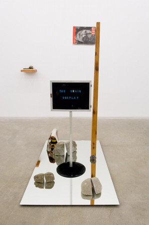 | JUDY RADUL 27 APRIL - 9 JUNE, 2012 OPENING RECEPTION: 26 APRIL, 7-9PM Catriona Jeffries is pleased to announce a solo exhibition of new and recent work by Vancouver-based artist Judy Radul, who's ambitious and complex installations of recent years have addressed the generative range and limits of theatrical space and performance. Radul's objects, cameras and performers trade roles, positions and tasks in the spatial choreography of her work, corporeally reanimating subject/object relations as contemporary technology increasingly functions in ways akin to human perception. Theoretically anchored in the discourse around experience and perception developed by Merleau-Ponty and Deleuze as well as recent writing on neuroscience, the exhibition acknowledges the intertwinement between one's own self and the world, while at the same time recognizing the limits of representation to wholly express this togetherness. As art thankfully produces inadequate forms and renditions of perception, the gap between a perception and its perception, a perception and its representation can thus be enacted and preserved. Radul purposefully steps into this gap to conjure joyful 'bad models' of perception in Object Analysis Spectator Poem (2012). A bottle, conch shell, fan, heater, chair, lectern, camera and clay bust all become entities on top of which partial swathes of painted copper sheeting lie across – like pajamas on a radiator – like 'a thing on top of the thing'. To complete Object Analysis Spectator Poem, Radul took the works into the street to be photographed, however direct vision does not suit the encounter she is seeking. Rather, using a mirror held at arm's length the objects are seen as they stood behind her. The image produced is an assemblage of forward and backward views. When installed in a spatial composition with the sculptures, they create a multifarious web of partial views, objects and forms. Two new works, which Radul terms 'displays' rather than 'sculptures', also appear in the exhibition. Motivation (2012) is a collection of small rocks (and some rock-like objects) ordered in a row. Their armature is a tilted plinth constructed at the maximum degree possible before gravity would have its way and the rocks would roll off its surface. Silver Screen (2012) is an ode to curtains, screens, and the thrill of feminist and postmodern theory in the 1980s, incorporating a used theatre curtain and a 1987 copy of the British film journal 'Screen', encased in plexiglass. Although skeptical of the reductionist impulse in much of the writing on science and aesthetics, Radul's interest in 'neuroaesthetics' (an emerging and much contested field which explores the potential neurological basis for aesthetic experience), originated in World Rehearsal Court (2009) through her use of neuroscientist V.S. Ramachandran's mirror box for healing phantom limb pain. Reference to the brain as an image, as well as a source of images, appears in The Brain Display (2010) and Midtown Plaza-end of the autopsy (2011). The new science of the brain is intensively remapping this organ, whose image exists as a kind of ultimate self-reflexive image. Judy Radul born in Lillooet, BC, lives and works in Vancouver) was awarded the DAAD residency in Berlin this year and her major installation World Rehearsal Courttraveled to the Henie Onstad Art Centre, Norway (2011) following its debut at the Morris and Helen Belkin Art Gallery, Vancouver. Recent solo exhibitions include Catriona Jeffries, Vancouver (2007); Oboro Gallery, Montreal (2006); Presentation House Gallery, Vancouver (2005); Set: Room 302 (collaboration with Geoffrey Farmer), Artspeak Gallery, Vancouver (2005); The Power Plant (2003). Her work has been included in numerous international group exhibitions, such as People Things Enter Exit, Catriona Jeffries, Vancouver (2011); Trust, 6th Seoul International Biennale of Media Art, Seoul, Korea (2010); Behind the Fourth Wall: Fictitious Lives – Lived Fiction, Generali Foundation, Vienna (2010); The Thing, Cultural Centre, Mechelen, Belgium, as part of All That is Solid Melts into Air, MuHKA, Antwerp (2009); Acting The Part: Photography As Theatre, Vancouver Art Gallery, Vancouver (2007); Intertidal: Vancouver Art and Artists, Museum Van Hedendaagse Kunst Antwerpen (MuKHA), Antwerp (2005); Videodreams: Between the Cinematic and Theatrical, Kunsthaus Graz, Austria (2004). She recently co-edited the book A Thousand Eyes: Media Technology, Law and Aesthetics published by Sternberg Press and a major monograph on her work, Judy Radul: People Things Enter Exit, was published by Presentation House Gallery in 2010. For further information or press enquires please contact Catriona Jeffries or Anne Low at +1 604 736 1554. | ||||