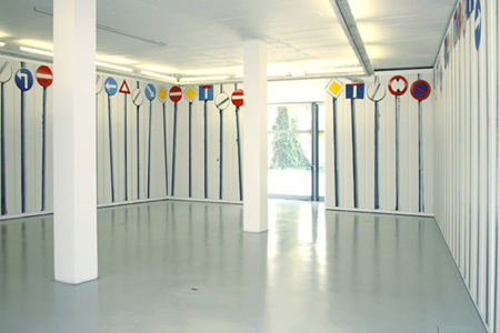 | Cristina Guerra Contemporary Art presents �Recession�, the first solo show in the gallery of the German artists Tatjana Doll (Burgsteinfurt, 1970). Tatjana Doll is best known for her large-scale paintings in which she employs a vocabulary assembled from images of life in the contemporary cities. Always figurative, and using recurrent motifs, her work can be broken down into several thematic groups: vehicles, containers, seats (stadiums, cinemas) and urban signage. Common places, easily recognizable, that think the visual repertoire of our contemporary society. Her painting is clear and direct. Admittedly bi-dimensional, Doll moves away from a key characteristic in painting, illusion, to present canvas upon which a sole element is portrayed on a white background. This choice to employ pre-existing images is interrelated with the artist�s will to deny the originality drive. The immediate reading that the works make possible, allow Doll to empty the signs of their meaning allowing the artist to concentrate solely on the image itself. By not making the decision on the content, Doll limits her subjectivity to her intervention in the search for the most intense way to paint. At Cristina Guerra Contemporary Art Tatjana Doll presents a group of 70 paintings of road signs. The artist decided to extend the poles in order for the sign itself to be located close to the ceiling. This decision bores two consequences, a violent encounter with a forest of bars (a grid that reminisces some minimalist interventions), which encloses the spectator within the space of the gallery; and the effort-making necessity to find the focus of the painting. This installation, specifically conceived for Cristina Guerra Contemporary Art, reflects the artist�s observation of the profusion of signs on the Portuguese roads and materializes her rumination about a society that, in seeking sophistication, needs to implement more and more rules of conduct. A society, which is increasingly oppressive of its citizens and that constantly imposes the paths they are to circulate. Tatjana Doll presents as well a group of paintings portraying one truck, three Lamborghinis and a couple of Dollar rolls. The whiteness of the canvas representing an erasure of the original context, allows the spectator to locate the object in an imaginary setting. The title of the exhibition although with a clear economical association (which is also true for the paintings themselves) relates not to the art market but more towards a stagnation of growth (road signs) as well as a suspension of content of the paintings. Until July 13th the work of Tatjana Doll can also be seen in the exhibition �Institutional and Poetic Violence� at the Museu de Arte Contempor�nea de Serralves, Porto. | ||||