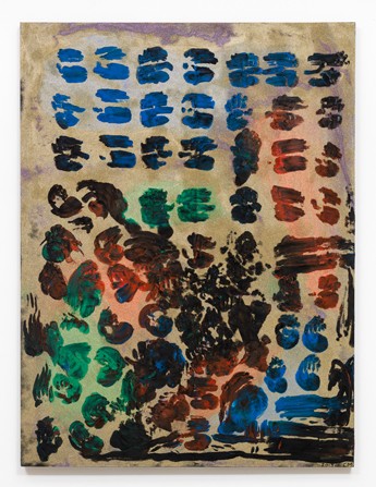 | Chris Martin September 21 – November 9, 2013 Opening reception: Saturday, September 21, 6:00–9:00pm David Kordansky Gallery is very pleased to announce an exhibition of new paintings by Chris Martin. The show will open on September 21 and run through November 9. An opening reception will be held on Saturday, September 21, from 6:00pm until 9:00pm. This is the artist's first exhibition at the gallery. Chris Martin is a key figure in contemporary American painting, and an abiding influence on a generation of younger artists. Since the 1980s he has created an expansive, open-ended, and constantly evolving body of work that eschews limits of every kind. His experiments challenge established ideas about physical scale; about the roles played by mediums, materials and techniques; and more broadly about what a painting is and how it functions as endeavor and artifact. But equally important are the ways in which his experimentation––and the abstract geometries and visual rhythms it engenders––permits access to unexpected spiritual and psychological dimensions, so that seeing can foster intimacy with the unseen. In this sense, Martin's work exemplifies a ritualistic approach to painting as a category of human endeavor, and intersects with a surprising array of cultural antecedents from many disciplines (including seemingly 'outsider' practices and religious iconographies). It also suggests that abstraction in painting is not necessarily part of a linear evolution of forms and intentions, but rather participation in a much broader activity comprised of Western and non-Western traditions alike. The abstract expressionists are important forebears, of course, but so are figures like James Brown, Forrest Bess, and Alfred Jensen, whose names have made recurring appearances in the work. The current exhibition features several different typologies. Prominent among them are the glitter paintings that have become a major focus for Martin in recent years. Layers of oil or acrylic paint are applied to canvas, followed by layers of holographic glitter, resulting in a deep, complex visual field that appears to be both representational and just beyond the grasp of standard perception, a constantly shifting landscape of the mind. In a new development, Martin has begun to trace marks in the glitter, pushing it aside and revealing fragments of the paint underneath. Because many of these marks are made using his own body, the 'windows' in the glitter are often shaped like the artist's open hand or closed fist, lending the work a primal immediacy. In a painting called Mwandishi, meanwhile, collaged images of jazz musicians (the title refers to a record by Herbie Hancock) have been dragged through the glitter layer. The comet-like trails of paint left behind them create a vertiginous play between positive and negative space, one made even more rich because the images themselves remain as remnants of the process. Collage and appropriated imagery play important roles in Martin's work––paintings in the show make use of a host of non-traditional materials, including vinyl records, stuffed lobsters, printed fabrics, and slices of bread. Still others rely only on painted images, but are centered upon forms like pointed stars and boldly colored, plant-like patterns that the artist has revisited continually over the years.These objects and forms serve as bridges between the otherworldly, psychedelic, and shamanic power of the compositions and the materiality and popular (even populist) accessibility of everyday life. They also help create the sense that the paintings, as a whole, are illustrative of a world that derives equal pleasure from its outward as well as its latent manifestations. This points to the generosity that permeates Martin's practice––indeed, many works originate as homages, however idiosyncratic, to other artists, or as commemorations of the energies surrounding a particular time in a particular place––and speaks to the fearlessness that makes each painting feel like a leap into the unknown. Chris Martin (b. 1954) was recently the subject of two major retrospectives: Staring into the Sun, Kunsthalle Düsseldorf, Germany and Chris Martin: Painting Big, Corcoran Gallery of Art, Washington, D.C. Recent group exhibitions include Submarine Wharf – XXXL Painting, Museum Boijmans Van Beuningen, Rotterdam, The Netherlands; Painting Now, Eva Presenhuber, Zürich, Switzerland; abstraction/quotidien, Passerelle Centre d'art contemporain, Brest, France; Pure Freude, curated by Johnny Mullen, Nationalmuseum, Düsseldorf, Germany; and The Painted World, P.S.1 Contemporary Art Center, Long Island City, NY. His work is included in a number of public collections, including the Albright Knox Gallery, Buffalo, NY; Denver Art Museum; and Museum of Contemporary Art, Chicago. Martin lives and works in Brooklyn, NY. | ||||