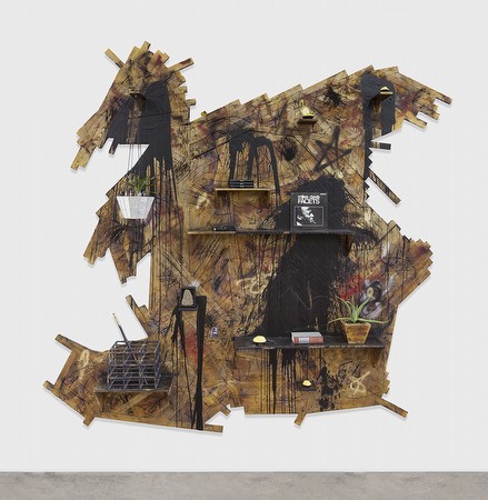 | Rashid Johnson - ISLANDS Opening reception: Saturday, September 13, 6:00-9:00pm David Kordansky Gallery is pleased to announce Islands, an exhibition of new work by Rashid Johnson. This is the artist's third solo show at the gallery, and the gallery's inaugural exhibition at its new location at 5130 W. Edgewood Place, Los Angeles. The show will open on September 13 and run through October 29, 2014. An opening reception will be held on Saturday, September 13, from 6:00pm until 9:00pm. Spanning both gallery spaces, Johnson's two-part exhibition features new wall- and floor-based sculptures. These include a hollow fifteen-foot high pyramid, shaped vitrine-like tables, and erratically contoured shelf works. Broadly taking a cue from Richard Wright's novel Native Son, and its antiheroic characterization of the African-American male, the sculptures embody an extreme unbound energy. In structure, material, and process, they express a tension unprecedented in Johnson's practice. In one gallery Johnson presents the solitary pyramid form as a perverse minimalist ruin. Comprised of identical open steel cubes, welded together to erect a progression of stacked blocks, the sculpture evokes the cubic structures of Sol LeWitt, realized at a habitable scale, as well as Carl Andre's modular works. Accordingly, Johnson has "occupied" this empty form. He has loaded it with signifying objects and dynamic matter from his artistic cosmology. The process of accumulation, which will be completed in Los Angeles, expresses yearnings both transgressive and assimilative. The pyramid, understood as a living organism or an externalized psyche, suggests an existence isolated by and at odds with an idealized, systematic order. Despite its faceted depths, the gridded sculpture is formally a cage or, following the exhibition title, an island. In contrast to this hermetic monument, Johnson populates the second gallery with a diversity of intimate, shaped wood table and shelf sculptures. Each resonates as a further island form, here scaled for interior space and domestic use. In his new table typology, each angular form's shaped and recessed top extends out beyond a base with a matching geometric profile, such that the top appears to hover in space. Johnson filled each top with shea butter, and then drew abstract marks into the resulting slab. Finished with a sheet of topping glass, each sculpture displays an expressive pictorial plane, but also provides a functional surface. Each is, to quote Johnson quoting Lawrence Weiner, "something to put something on", and a shared site for congregation. In the accompanying wall-mounted shelf sculptures, Johnson aggregates marks and material with a layered intensity. This complexity begins with the wood substrate, in which he assembles thicket-like crossings of red oak planks into biomorphic shapes. Johnson allows the outermost ends of the planks to extend irregularly, forming a jagged, seemingly splintering edge to each form. Upon this surface he then enacts his most elaborate, multi-step process of mark-making to date, which includes layers of spray paint, branding, scratching, poured soap and wax, and finally arrayed shelves and objects. The resulting compositions, visually unpredictable at every level, are at once amorphous, expansive, and volatile. Johnson's practice regularly reimagines popular narratives that shape contemporary African-American identity, remixing them with his own personal history, and his growing lexicon of formal signifiers. His early "New Negro Escapist Social and Athletic Club" celebrated a supernatural black elite, and he has since more ambivalently adopted the perspective of African dictators, or Camus's L'Etranger. Here, for the first time, Johnson generates a body of work from an antiheroic stance. The attitude recalls outlaw Ivanhoe Martin, as depicted by Jimmy Cliff in The Harder They Come, or Sweet Sweetback, Melvin Van Peebles's proto-Blaxploitation icon, but most prominently Bigger Thomas, Wright's protagonist of Native Son, an impoverished black youth driven to multiple murders by the anxiety, anger, fear, and loneliness inscribed by his social plight. The forms of Johnson's Islands play out a like meta-narrative in their dissociation from Johnson's studio to the white cube and beyond, where not only are their internal mechanics on display, but each becomes an isolated figure subject to the pressures of a larger social field. Rashid Johnson (b. 1977) has recently presented solo exhibitions of his work at The George Economou Collection, Athens; the Museum of Contemporary Art, Denver; Ballroom Marfa, TX; South London Gallery; SculptureCenter, Long Island City, NY; Kunstmuseum Kloster Unser Lieben Frauen, Magdeburg, Germany; and the Indianapolis Museum of Art. A mid-career survey of his work entitled Rashid Johnson: A Message to Our Folks, was organized by the Museum of Contemporary Art, Chicago, and traveled to the Miami Art Museum; the High Museum of Art, Atlanta; and the Mildred Lane Kemper Art Museum, St. Louis. Recent group exhibitions include Variations: Conversations in and Around Abstract Painting, Los Angeles County Museum of Art; In the Holocene, MIT List Visual Arts Center, Cambridge, MA; American Exuberance, Rubell Family Collection, Miami; ILLUMInations, International Pavilion, 54th Venice Biennale; and Secret Societies. To Know, To Dare, To Will, To Keep Silence, Schirn Kunsthalle, Frankfurt and CAPC de Bordeaux. In December, Johnson will open a solo exhibition at Kunsthalle Winterthur, Switzerland, and his "Cosmic Slop" paintings will be featured in the group exhibition The Forever Now: Contemporary Painting in an Atemporal World, curated by Laura Hoptman, at the Museum of Modern Art, New York. | ||||
