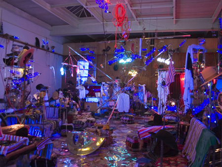 | Images: Jason Rhoades Black Pussy, 2006 Mixed media installation including wire metal shelving, neon glass, dreamcatchers, cowboy hats, Chinese Gonshi stones, hookah pipes, camel saddle footstools, glass vegetables and other items. Approximate dimensions: 2960 sq. ft. Photographs by Douglas M. Parker Studio Courtesy Estate of Jason Rhoades; Galerie Hauser & Wirth, London and Zurich; David Zwirner, New York Jason Rhoades� untimely death in 2006 at age 41 cut short a career which, through the sheer audacity, scope, and ambition of his prolific artistic output since 1993, promised to make him one of the defining artists of his generation. While often perceived as a maverick - constantly changing styles, materials, and intellectual approaches for each project, it is the very continuity and reoccurrence of Rhoades� most important concepts and concerns throughout his career that is the hallmark of his final exhibition, Black Pussy, conceived by the artist in 2005 and 2006 and completed in Rhoades� studio shortly before his death. The last installment in a trilogy of work that includes Meccatuna (2003) and My Madinah: in pursuit of my ermitage�(2004), Black Pussy remains one of Rhoades� most mysterious works, and his most ambitious. Sprawling roughly 3,000 square feet, the work presents itself as a large installation, dominated by an empty stage bearing a neon sign which reads �Live in the Black Pussy.� The work also features 185 neon pussy word signs, as part of the artist�s ongoing project of creating a cross-cultural compendium of synonyms for female genitalia. Large storage racks are covered with myriad objects, including hundreds of Egyptian Hookah pipes from a seized shipping container, over 350 unique Dream Catchers (a traditional Native American fetish object used to filter dreams), 89 beaver-felt cowboy hats, 72 Chinese Scholar stones, Venetian glass vegetables (and Chinese knock-offs), colorful cloth rugs, a homemade aluminum replica of Jeff Koons� famous stainless steel Rabbit (1986), and more. To one side, a large macram� textile object covers the wall. Beyond the formal juxtapositions created, the individual elements in the massive installation interact symbolically, communicating dichotomous relationships of masculine versus feminine, Eastern versus Western traditions, the handmade versus the mass-produced, and the authentic versus the fake. Black Pussy is foremost a sculpture; however it is not merely the result of material objects chosen by the artist, but also the activities of participants in the ten Black Pussy soir�es held in his Los Angeles studio. For a period of six months, the artist invited a small group of selected guests to attend a series of events officially known as Black Pussy Soir�e Cabaret Macram� . Though seemingly improvised, these evenings were highly structured hybrids of performance, Happening, dinner party, and art opening. Rhoades hired performers, but also expected a high level of guest participation with the intention that these soir�es would add to the constantly evolving Black Pussy installation. Each guest not only contributed a new personal pussy word to his encyclopedic list, but also a bit of themselves in the form of charisma�their intangible and individual spiritual power. The events were heavily documented in the form of photographs, which were both physically incorporated into the installation and used to compile a coffee table book, and also in the form of a soundtrack, which became a part of the work itself. Only after the addition of sound - the auditory remains of the cycle of soir�es � did Rhoades consider the sculpture complete. It is important to note that Rhoades did not intend to continue the soir�es once the work was shown in a different context. These events were clear extensions of the artist�s studio practice, creating not only an aura for the work, but also turning the ephemeral quality of the participatory evenings into concrete material for his sculpture. The varied materials found in Black Pussy, the formal density, and the strange soundtrack (especially powerful today, as we mostly hear the artist�s voice) create a narrative of utmost complexity, or conversely, multiple narratives. An undoubtedly provocative title, Black Pussy refers most directly to the darkness of the cavernous installation within Rhoades� studio and the ultraviolet lights which are the sole sources of illumination in the space. The notion of absence, so powerfully illustrated by the empty stage and the disembodied voices on the soundtrack, is especially poignant when we contemplate Rhoades� favorite white suit, which the artist placed in the middle of the piece, in lieu of a signature, just days before he died. While Rhoades could be the most dazzling colorist and materialist (as is abundantly evident in Black Pussy), it is really his conceptual vigor that frames and connects his oeuvre, and makes him the ultimate artists� artist, not only as someone who commands the respect of his peers, but as an artist who redefined the arena in which art is possible, and tried to expand the boundaries of this arena. The conditions under which art is made, shown, and consumed were sources of enormous interest for Rhoades, and it is his continuous assault on these conditions and rules that made his work so challenging and fascinating. For Rhoades, the creative process demanded ultimate freedom. His work could be dangerous, overwhelming, politically incorrect, obnoxious, or utterly sublime. Rules and conventions were materials for Rhoades, and he subverted them not out of bratty adolescent impulses, but because he understood them to be safety nets in the art-making process, and knew that, once these were removed, there lay a whole new set of challenges for the artist and his audience. Rhoades� work can be both physically and visually demanding, yet it is its intellectual challenges which often prove most daunting. It takes