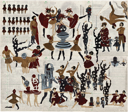 | MARCEL DZAMA Behind Every Curtain February 17 � March 19, 2011 Opening reception: Thursday, February 17, 6 � 8 PM Book signing with the artist: Saturday, March 5, 4 � 6 PM David Zwirner is pleased to present a solo exhibition of new work by Marcel Dzama, on view at the gallery�s 525 West 19th Street space. The exhibition will feature the artist�s film, A Game of Chess, alongside related drawings, sculptures, and dioramas. Dzama has become known for his prolific drawings, which are characterized by their distinctive palette of muted browns, grays, greens, and reds. In recent years, the artist has expanded his practice to encompass three-dimensional work and film and has developed an immediately recognizable language that draws from a diverse range of references and artistic influences, including Dada and Marcel Duchamp. Dzama�s film features characters based on the classic game of chess. Dressed in geometrically designed costumes of papier-m�ch�, plaster, and fiberglass and wearing elaborate masks (including a quadruple-faced mask for the King), the figures dance across a checkered board to challenge their opponents in fatal interchanges. Chess occupied a central role for the early twentieth-century avant-garde, who drew explicit analogies between the game (with its intricate balance between improvisation and predetermination) and artistic practice. Dzama is influenced by German Bauhaus artist Oskar Schlemmer, whose Triadic Ballet from 1922 included puppet-like, costumed, and mask-wearing figures dancing across a checkered surface. French film-maker Ren� Clair and painter Francis Picabia were amongst other artists who integrated ballet and chess in their works from the 1920s, employing the special set of rules and moves of the game as metaphors for larger questions regarding free will, destiny, and technological determinism. Both the filming and the creation of the costumes for A Game of Chess were carried out in Guadalajara, Mexico, and the influence of local crafts and religious traditions can be felt throughout this body of work. Notions of scapegoatism and resurrection blend with the timeless idea of rivalry represented by the game, and distinctions between reality and fiction ultimately become blurred as both costumed and �real-life� characters in the film are killed. The storyline in this way recalls the Surrealist predilection for dream logic over conventional narrative form�epitomized by Luis Bu�uel�s films from the late 1920s and early 1930s. However, Dzama still retains a strong sense of a plot, with subtle insinuations to contemporary life discernible throughout. The exhibition will also present rotating sculptures based on central characters in the film, as well as a mechanized carousel with puppets made from tin and ceramics. Upon entering the exhibition, visitors will first encounter Dzama�s drawings and a room of sculptures before reaching the film installation. This gradual, three-tiered transition from flat, wall-mounted works, via rotating sculptures, to moving images coincides with a shift from light, quiet spaces to the darkened area of the film with its accompanying acoustics. Further emphasizing this contrast, a mariachi band will stage a live performance of music inspired by the film�s soundtrack on the exhibition�s opening night and at selected times throughout its duration. An exhibition catalogue, designed in collaboration with the artist in the format of a small sketchbook, will be published on the occasion of the show. The publication will include drawings, storyboards, dioramas, and film and production stills from the making of A Game of Chess. Marcel Dzama was born in 1974 in Winnipeg, Manitoba, Canada. In 2010, his work was the subject of a solo exhibition at the Mus�e d�Art Contemporain de Montr�al, Canada, which will travel to Oakville Galleries, Oakville, Canada (2011) and the Dalhousie Art Gallery, Halifax, Canada (2012). Other recent solo and group shows include those organized by The Museum of Modern Art, New York (Compass in Hand: Selections from The Judith Rothschild Foundation Contemporary Drawings Collection, 2009 and The Compulsive Line: Etching 1900 to Now, 2006); Pinakothek der Moderne, Munich (2008, solo); the Irish Museum of Modern Art, Dublin (Order, Desire, Light, 2008); and the 2006 Whitney Biennial, Whitney Museum of American Art, New York. The artist�s work will be featured in upcoming solo exhibitions at the Gemeentemuseum, The Hague, The Netherlands (March - June, 2011); Kunstverein Braunschweig, Germany (September - November, 2011); and the Contemporary Art Museum, Guadalajara, Mexico (2011). The artist lives in Brooklyn, New York. For all press inquiries, please contact Ben Thornborough at David Zwirner 212-727-2070 [email protected] | ||||