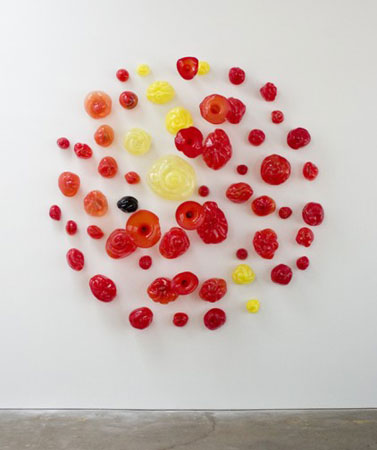 Katy Schimert, Red Sun with Black Heart, 1999 59 glass blown objects 4 inch diameter to 17 inch diameter each overall: 8 ft. diameter 12 in to 17 in high | |||
