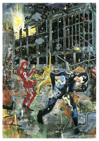 | DANIEL RICHTER: Die Idealisten David Zwirner is pleased to present an exhibition of new work by German artist Daniel Richter. This will be the artist�s second solo exhibition at the gallery and will feature a selection of paintings and works on paper. Richter is currently the focus of an expansive survey, which traveled in 2007 from Hamburger Kunsthalle, Hamburg, Germany to Gemeentemuseum Den Haag, Den Haag, The Netherlands. The exhibition opens at Centro de Arte Contempor�neo de M�laga, M�laga, Spain in April and continues in the fall to the Denver Art Museum, Denver, CO, his first solo museum exhibition in the United States. When Daniel Richter entered the Academy of Fine Arts in Hamburg in the early 1990s, the previously untrained artist viewed art as an opportunity to combine �freedom � as vague or idealistic as that concept may be � with aimlessness.�� He first became known for his colorful abstract paintings, exploring superficiality and excessive ornamentation via patterning, repetition, arabesques, drips, and graffiti outlines. The artist garnered critical success in 1999 when he introduced large-scale figurative paintings. Despite the perceived departure, Richter actively maintains that the dichotomy between abstract and figurative painting is a constructed fiction, since the formal problems of color and composition remain constant. Embracing an overtly psychedelic aesthetic, Richter�s works are often painted with bright, almost fluorescent colors, pulsating and swirling as if they had materialized from a chemical reaction taking place on the surface of the work. Even in the sparser compositions, the canvases seem to swell with abundant activity and nervous intensity. The quieter spaces in his compositions reveal a coexistence of many different brushstrokes, patches, and spots, adding to the overall feeling of erupting energy. The artist�s work consciously exists in a long tradition of painting, notably indebted to history painting. Richter is deeply interested in artists like Werner B�ttner, Albert Oehlen, and Martin Kippenberger for what he has described as an �arrogant, loud-mouthed conceptualism.�� Concerned with problems of authenticity and documentation, Richter often finds inspiration in magazines, newspapers, and books. His works are equally activated by an engagement with dream states; thus Richter�s images exist essentially as collaged constructions. Rife with both latent and overt violence, skepticism, political struggle, social transformation, and public upheaval, the paintings concurrently brim with humor and exuberance, as dynamic celebrations of the medium. Vis-�-vis the painterly process, drawing functions for Richter as a vital mode of understanding the possibility and durability of his subjects. Within his artistic practice, the works on paper extend beyond experiments in composition to encompass psychological studies of his themes. The painting Die Idealisten, 2008, from which the exhibition derives its title, emblematizes the aggressive fervency, which has come to characterize the artist�s work. In this anarchic canvas, three boldly colored figures writhe amidst a fiery, destructive urban scene; however, their poses seem more evocative of rock musicians, than rioters. The conflation of music and social unrest underscores Richter�s early punk and leftist affiliations, but resolutely defies definite political commentary. � P. Kaiser, Interview with the artist in Huntergrund (Ostfildern: Hatje Cantz Verlag, 2006), p. 196. � Kaiser, pp. 196-197. | ||||