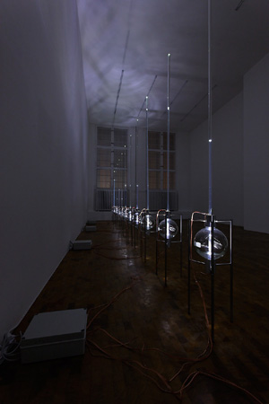 | Gr�nlund-Nisunen November 21 � December 23, 2009 On the occasion of their third exhibition at Esther Schipper, Gr�nlund-Nisunen two new works dealing with the visualization of motion, energy and space. Tommi Gr�nlund and Petteri Nisunen have been working together since 1993 in the fields of architecture, art and music. With their simple formal idiom and their use of geometric forms such as line, plane and circle, the artists combine aspects of kinetic art with references to modernism. In their works an experimental artistic practice in the course of which materials and techniques take shape. The artists build all the individual components themselves and use the exhibition context to develop test situations whose results remain unpredictable. The use of low-tech material is part of this artistic approach belonging to the formal parameter of experimental electronic music. In the gallery�s darkened main space stand twelve glass tubes supported by metal structures, arranged in a line across the width of the room. Liquid Diagram (2009) consists of a group of four works presented here together in a large installation created specially for the exhibition. Each work consists of three glass tubes mounted on round bottomed flasks filled one quarter full with distilled water and connected by a system of switches. An electrical heating element controls the air temperature inside the flasks. The flasks are lit from below, making the rising and falling of the water level visible. At the same time, a poetic element is introduced into the technical process. The system is a sensitive one which reacts not only to the different heat states, but also, like a barometer, to uncontrollable fluctuations of pressure outside the unit. In the smaller room, a stainless-steel wheel rotates on its axis halfway between floor and ceiling. The title Cyclon (2009) refers to the motion of the object, which is driven by a small motor. The movement produces a draft. The prints 50 circles (2007) and 100 circles (2007) are part of a series of five black-and-white screen prints on paper in a limit edition of twelve. They illustrate interferences created by the overlapping of simple, graphic elements such as straight and curved lines. Tommi Gr�nlund runs the internationally successful music label S�hk� Recordings and gave important impulses for the development of interdisciplinary electronic music. Among others he produced music positions like Jimi Tenor and Pansonic. More Information www.sahkorecordings.com and www.g-n.fi To coincide with the exhibition, argobooks, Berlin, is publishing the first major artist�s book by Gr�nlund-Nisunen. As well as essays by Jyrki Siukonen and Carl Michael von Hausswolff, the book includes an overview of works and projects realized over the past decade including descriptions and where each work has been shown. More information at: www.argobooks.de For further information please contact Nina K�ller: [email protected] | ||||
