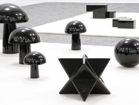 | Sobre o Objeto de 8º Grau José Damasceno 17.05.2014 | 14.06.2014 We are pleased to present the exhibition Sobre o Objeto de 8º Grau by José Damasceno. The artist is presenting his most recent installation, homonymous with the title of the show, along with a set of silkscreens and a painting on the wall of the exhibition space. Sobre o Objeto de 8º Grau [On the Object of 8th Degree] is a set of small obsidian sculptures distributed on two rectangular felt mantels on the floor, like recent discoveries of an archaeological site. Damasceno, who frequently uses different kinds of rocks in his sculptures, this time, chose obsidian, which sparked his interest during his trips to Guadalajara. It is a sort of volcanic glass, created by the rapid solidification of magma; found widely in pre-Columbian Mesoamerica, it was used as a mirror as well as a weapon, and was frequently associated to occultism and Aztec rituals. Contrasting with the opacity of the felt, the black reflective surface of each piece of obsidian reflects the surface of each of the other pieces in the exhibition, creating an interplay of mirrors that recalls the short text “La imagen de séptimo grado”, by Argentine writer Macedonio Fernández. In it, the author describes the trip of an image through different reflections (including the memory and pictorial representation) and sets forth the idea that in each reflection the image leaves its own inscription. This situation is similar to that of Estudos Paragráficos II, a set of twelve silkscreens arranged linearly on the wall next to the installation. In these works, the word paragráfico reveals a mediation between the graphic inscription and its possibilities of materialization, underscoring the tension between the bi- and tridimensional, the virtual and the real. Damasceno’s work lies in the borderline zone where the imaginary is multiplied in various reflections of language, and the experience of the real is diluted in these reflections. The aim of Damasceno’s proposal is not, therefore, to present an object of the eighth degree, but to invite the observer to seek it. José Damasceno was born in Rio de Janeiro, where he lives and works. His solo shows have most notably included Coordenadas y Apariciones, Museo Nacional Centro de Arte Reina Sofía, Madrid, Spain (2008); Espace Topographie de l’Art, 37 Festival d’ Automne à Paris, France (2008); Viagem à Lua, 52nd Biennale di Venezia, Brazilian Pavilion, Venice, Italy (2007); and Observation Plan, Museum of Contemporary Art, Chicago, USA (2004). Group shows he has participated in most notably include Cruzamentos: Contemporary Art in Brazil, Wexner Center for the Arts, Ohio, USA (2014); the Biennale of Sydney, Australia (2006); and the XXV Bienal de São Paulo, Brazil (2002). His work figures in various public collections, including Cisneros Fontanals Art Foundation – CIFO, Miami, USA; Colección Jumex, DF, Mexico; Daros-Latinamerica AG, Zurich, Switzerland; Inhotim Centro de Arte Contemporânea, Brumadinho, Brazil; MACBA – Museu d´Art Contemporania de Barcelona, Barcelona, Spain; Museu de Arte Moderna do Rio de Janeiro, Brazil; Museu de Arte Moderna de São Paulo, Brasil; and MoMA, New York, USA. | ||||