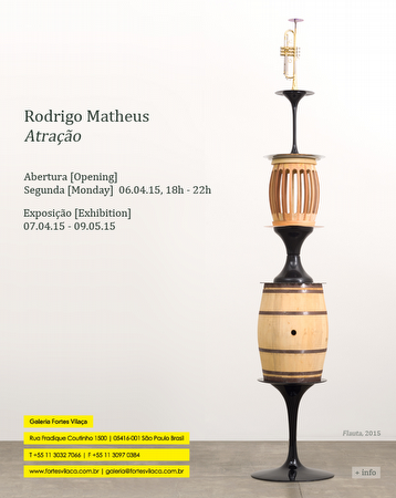 | Rodrigo Matheus Atração Abertura 06.04.2015, 18h - 22h Exposição 06.04.2015 | 09.05.2015 Galeria Fortes Vilaça Rua Fradique Coutinho 1500 05416-001 São Paulo Brasil A Galeria Fortes Vilaça tem o prazer de apresentar Atração, a nova exposição de Rodrigo Matheus. O artista apresenta esculturas inéditas construídas a partir da associação entre objetos domésticos e peças industriais encontrados em diversas lojas da cidade de São Paulo. Ao unir em um só corpo materiais de natureza genérica, as obras invertem a lógica industrial da produção em massa, assim como as noções primárias sobre forma e função. Rodrigo Matheus ativa o espaço da galeria de diversas maneiras: com obras se erguendo do chão, penduradas no teto, suspensas, ou correndo ao longo das paredes − o que confere à mostra um caráter “instalativo”. Dois exemplos são as obras Abraço e Elevação, onde folhas e galhos de plantas artificiais são organizados nas paredes. Elas levam ao limite as relações entre construção e natureza ao atribuir qualidades arquitetônicas a elementos supostamente orgânicos. Flauta reforça a ideia de ritmo com o qual cada peça se insere no espaço. Trata-se de uma pilha de objetos que se ergue até o teto, composta por uma mesa Saarinen, um barril, uma lâmina circular, um prato de bateria, um trompete, entre outros elementos. Sua construção depende de coincidências industriais entre medidas, resistência e forma. Através dela, o artista discute o caráter distópico do design moderno, hoje amplamente copiado e vendido no mundo inteiro em lojas como Ikea ou Tok&Stok. Os objetos que compõe Atração − trabalho que dá nome à mostra − são cabos, elásticos, âncoras e roldanas fixadas no teto. Peso e tensão configuram um desenho no espaço e alteram de maneira bem humorada a personalidade das peças que compõe o arranjo. Com Torre, o artista cria uma espécie de monumento com pequenos módulos de vidro e plástico. Em sua função original, essas estruturas seriam usadas como mostruários para exposição de produtos em lojas, mas no trabalho de Matheus tornam-se o próprio assunto. Evidencia-se aí o interesse do artista em dar destaque a elementos que, na tradição da arte e do design, são pensados para serem apenas suportes. Na inversão da lógica presente no trabalho de Matheus, a base já é a escultura. As esculturas de Atração reafirmam o interesse do artista por temas como a natureza da representação, design, artificialidade. O arranjo preciso entre as partes que compõe cada trabalho provoca um jogo de relações inesperadas, que levam em conta suas qualidades inerentes, o circuito social e as relações de poder presentes em cada componente da mostra. Através dessas articulações, Rodrigo Matheus aponta para o potencial poético e estético de objetos banais que, uma vez livres de função, revelam novas possibilidades de sentido e compreensão para além do que foram concebidos. Rodrigo Matheus nasceu em São Paulo em 1974 e atualmente vive e trabalha em Paris, França. Suas exposições individuais recentes incluem: Coqueiro Chorão, Ibid Projects (Londres, Reino Unido, 2014); Do Rio e para é to Rio and from, Galeria Silvia Cintra + Box 4 (Rio de Janeiro, 2014); Colisão de Sonhos Reais em Universos Paralelos, Fundação Manuel António da Mota (Porto, Portugal, 2013). Suas exposições coletivas incluem: Imagine Brazil, Instituto Tomie Ohtake (São Paulo, 2015) − mostra itinerante originalmente exibida no Astrup Fearnley Museet (Oslo, Noruega, 2013); 3ª Bienal da Bahia, MAM-Bahia (Salvador, 2014); Champs Elyseés, Palais de Tokyo (Paris, França, 2013); 32ª Panorama da Arte Brasileira, MAM-SP (São Paulo, 2011); The Spiral and the Square, Bonniers Kontshall (Estocolmo, Suécia, 2011). Sua obra está presente em importantes coleções, como: Instituto Inhotim (Brumadinho); MAM Rio de Janeiro; MAM São Paulo. --- Rodrigo Matheus Atração April 6 -‐ May 9, 2015 Galeria Fortes Vilaça is pleased to present Atração [Attraction], the new exhibition by Rodrigo Matheus. The artist presents new sculptures constructed based on associations between household objects and industrial pieces found in various stores in the city of São Paulo. By bringing together materials of a generic nature and uniting them in one body, the works invert the industrial logic of mass production, as well as the primary notions of form and function. Rodrigo Matheus activates the gallery space in different ways: with works stretching up from the floor, hanging from the ceiling, suspended, or running along the walls – thus conferring an “installational” character to the show. Two examples are the works Abraço [Hug] and Elevação [Elevation], where the leaves and stems of artificial plants are organized along the walls. They deal with the relations between construction and nature, stretching them to the limit by attributing architectural qualities to supposedly organic elements. Flauta [Flute] reinforces the idea of rhythm that governs the insertion of each piece in the space. It consists of a pile of objects that rises up to the ceiling, including a Saarinen table, a barrel, a circular sheet, a drum cymbal, a trumpet, and other things. Its construction depends on industrial coincidences of sizes, strengths and shapes. In this way, the artist discusses the dystopian character of modern design, today widely copied and sold around the world in stores like Ikea or Tok&Stok. The objects that make up Atração – the work that lends its title to the show – are ropes, bungee cords, anchors and pulleys attached to the ceiling. Weight and tension configure a drawing in space and good-‐humoredly alter the character of the pieces that compose the arrangement. With Torre [Tower], the artist creates a sort of monument out of small modules of glass and plastic. In their original function, these structures would play a minor role, making up shelves and ra