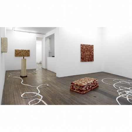 | Michel Blazy Débordement domestique 17th march - 5th may 2012 They’re not interested in believing, their concern is a will to believe. Their goal is to be on the road, even if the road doesn’t lead anywhere. They don’t know about threat and will never have anything to lose. Alive and pretty, they simply are: Lasagnas Michel Blazy – 1992 Michel Blazy has created a universe made of perishable, live and mutating matter. His use of organic and live materials of humble extraction that can be found in any kitchen or garden gives birth to a lively, animated, shifting and strange kind of art. His installations are encounters of materials that aim at stretching a moment’s duration through different strategies of survival. The first strategy used by living matter for its own safeguard is breeding, and Michel Blazy’s works apply the same method to ensure their own survival; they breed and reoccur; beckoning the artist to find the right gesture and fulfill all necessary material conditions to succeed. Hence, his produced artifacts will fit into a cycle of living-matter and create a sort of anti-time ritual much akin to a natural-life strategy. For his new solo exhibition at Art:Concept, Michel Blazy has taken over the gallery and produced a sensory area designed to provoke a unique moment. This will lead the visitor to make his way across a tactile, visual and olfactory path among pieces that no longer hang from tidy picture-rails but occupy the entire space with their oddity. Far from shunting art into the role of descriptive phenomenon in charge of embellishing things and exclusive to just an illusionist record, Michel Blazy promotes it to the level of a new form of intuitive knowledge capable of short-circuiting our perception of space. The floor undulates under the meanderings of a long tin-foil snake, walls melt and mutate on the whim of biological processes as pizzas turn into paintings and lasagnas into sculptures, while a beer-bottle is in charge of doing the foam-fountain act every evening at 6 p.m. By this jumble of foods, the artist invites us to observe, touch, and feel things and to imbue ourselves with all the uniqueness of the present instant. We are not supposed to look at objects in a perspective of possession, but to appreciate them according to the uniqueness of an instant; experiencing the only way in which emotions are produced. Like many contemporary artists, Michel Blazy is heir to various artistic legacies ranging from Arte Povera to post minimalism and Duchamp’s ready-made, the whole sprinkled with Neo-Realism as well as with a touch of Color-Field Painting. However, he does not claim to be the follower of any of these movements and has developed, over the past twenty years, a very personal and surprising form of artistic practice. The transformative character of his proposals, even when realized, prevents his productions to ever turn into definite forms and allows them to remain suspended between the moment of creation and the path that they will follow in their empirical development. Michel Blazy’s hybrid works are more than just experimental food gardens left at the mercy of time; quotes from art history and cultural references are numerous, and allow the artist to interrogate and question our times through considerations on unpredictability and an inevitable certainty tainted by consumerism in which our society is sadly immersed. Therefore, the multiplicity of possibilities offered to spectators engages us to look closer at these metamorphoses, which remind us of the mutations that occur under our very eyes in realm of what we consider our ordinariness. Nature, like any eco-system, be it human, animal or vegetal, is defined by the symbiosis of different apparently contradictive domains: minerality for example complements the dynamism of life, forming a complex whole that could never be reduced to its mere positivist aspects. In this exhibition, Michel Blazy sets up a choreography of junk-food culture, creating a vanitas-painting in which skulls and candles are replaced by industrialized, common and perishable products that surround us in our everyday-life and tell us about pleasurable moments of regression that mean nothing special but still inscribe themselves in our time. Michel Blazy’s critique is by no means bitter or stern, it comes from a desire to question works of art as such, because according to him artworks are not to be reduced to their material side but must be defined according to the place they occupy in the world of culture. It is all about deciphering all the symbols that we receive both from nature and from our environment to try and gain access to a higher plane. To be able to do this, the full acceptance of a mobilization of our senses is required. By means of an artistic language that often sings the praises of "letting loose" in a sort of "effortless doing", the artist implements a perceptible system in which our senses become a link between the observer and the observed. This allows different possibilities to be interwoven as many sensorial and experimental possibilities that help us better understand the architecture of our own thought while searching for new paths, meanings or interpretations behind the pervading reality of the world. - Aurélia Bourquard Traduction : Frieda Schumann | ||||