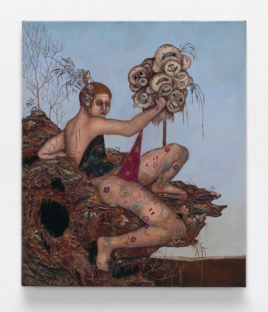 | Anj Smith The Flowering of Phantoms 15 January – 23 February 2013, Hauser & Wirth New York, 69th Street New York, NY… The eerie, luminous, compact portraits and landscapes of London-based artist Anj Smith are exercises in extravagant meticulousness. The magic of her laboriously depicted figures and motifs, however, derives in large part from the contrast Smith creates in surrounding areas of loamy, thickly applied impasto. This formal incongruence – between the intricate and the inchoate, between a jewel-like glow and rough scratchings, between filigree and mire – is crucial to Smith’s work. It suggests that she seeks to navigate a murky psychological space far beyond the reach of her virtuosic single-bristle brush. In her world, certainty is just a vestige of the past, with everything today existing in a fragile, constantly shifting instability. Beginning 15 January 2013, Hauser & Wirth New York will present ‘Anj Smith: The Flowering of Phantoms’, an exhibition of new paintings that will remain on view in the gallery’s East 69th Street townhouse through 23 February. The exhibition coincides with the publication of ‘Anj Smith – Paintings’, the first major monograph devoted to the artist’s work. With the title of her exhibition, Anj Smith points to the central theme of her practice. Citing Netherlandish vanitas paintings, she has written, ‘Those artists worked with a visual language comprised of symbols that had very clear, established meanings, codified and knowable. Back then a skull was depicted to remind viewers of their mortality. In our time – and therefore in my work – there is no single concrete narrative. Symbols no longer stand for fixed intentions and a skull can mean pretty much anything, including, at the moment, an iconic motif for a scarf. Even so, I feel those old defunct symbols retain a kind of ‘half-life’ meaning, a vestige of their purpose. As their original content decays in the present, they still suggest something to us, even if that ‘something’ is less clear and is morphing into something else’. In Smith’s paintings, these decaying phantoms of meaning are phenomena in their own right, blossoming literally and figuratively, suggesting multiple new, if bewildering, meanings as they evolve. A thematic corollary to such general elusiveness is the gender ambiguity in many of Smith’s portraits. In ‘The Moon, Like a Flower’, the delicate features of a sitter with long blonde hair might equally be described as feminine or effeminate, and are interrupted by sprouting facial hair that could indicate male pubescence. In ‘The Sentry’, the viewer’s eye sweeps down from a lipsticked mouth and intricate headpiece of feathers and fossils, to a pair of massive masculine thighs and a flower-covered codpiece that protects the mystery of the figure’s identity. Both isolated and on display, these subjects maintain their distance from the viewer but are far from idle: Smith’s subjects deliberately frustrate norms of composure, decorum and self-possession. Half naked and at the same time elaborately attired, their fantastical ensembles simultaneously camouflage and affirm individuality. In the works on view in ‘The Flowering of Phantoms’ – in such formal portraits such as ‘Ziggy’ and ‘High Blue Country’, as well as the wider compositions like ‘New Blooms at The Ossuary’ – organic and inorganic objects alike tend to snake, coil, twine, twist, and weave, teasing the eye with tendrils, creepers, roots, and veins. By collapsing the traditional genres of ‘portrait’ and ‘landscape’, Smith suggests a territory in which neither one is adequate to represent contemporary experience. Time is often fragmented in Smith’s scenes, which appear simultaneously retroactive and futuristic but neither firmly of the past or the present. In ‘Fruits Of The Forest’, fossils seem to decay into base-matter faster than the ‘fruits’ of such fashion sensations as sequined fabric. While the artist is rendering a bleak and inhospitable environment, she suggests possibility: The makeshift structures she depicts may be cobbled together from wire, cigarette butts and twigs, but between them gauzy tangles of exquisite fabric stretch into new configurations. | ||||
