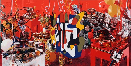 The centerpiece of the show is FUN, a large painting (46 x 90 inches) of a decorated party room that started with good intentions, but is on the verge of careening out of control. The issue is confused and crowded by the inclusion of art works among the decorations. Hovering in the middle of the activity is a large modernist emblem that attempts to reassure that the center will hold.
