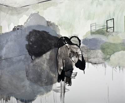 Pleasant's earlier paintings were arranged in a loose storyboard grid, suggesting an unfolding narrative. Her new paintings focus on a specific moment and isolate one image. In Kiss 2, a couple embraces and floats among cloudlike shapes in a vaguely defined architectural space. The couple is painted mostly in black silhouette or contoured line and each figure has no distinguishable features. They function like avatars, in a space that invites the viewer to project his or her own cast.