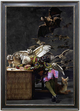 On view in the back gallery is a photographic series based on Francisco Goya y Luciente's etching, The Sleep of Reason Produces Monsters, from his 1799 Los Caprichos print series. In each of the five photographs, menacing animals swirl about the sleeping figure, whose ethnicity changes with every image. All wear Victorian-style garments made from richly-hued African textiles� in fact, materials that were previously imported by the Dutch to Africa and have become so closely associated with the continent that they are assumed to be indigenous. Shonibare emphasizes the complexity of cultural identity while arguing for a delicate balance between fantasy and the real, a sentiment shared by Goya, who warned, "Imagination deserted by reason, begets impossible monsters. United with reason, she is the mother of all arts, and the source of their wonders."