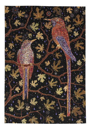 FRED TOMASELLI, After Migrant Fruit Thugs, 2008 Wool background, silk birds with metallic thread detail, 2.5 x 1.6m (8' 2" x 5' 4") Ed of 5. � Fred Tomaselli. Courtesy of James Cohan Gallery and Banners of Persuasion