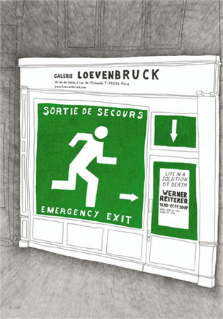 A l�occasion de sa deuxi�me exposition personnelle � la galerie Loevenbruck, Werner Reiterer pr�sente un ensemble de dessins accompagn� de quatre sculptures in�dites. L�espace d�exposition se pr�sente comme une sortie de secours, permettant de fuir temporairement la vie ou le monde qui nous entoure. L�artiste se donne un r�le de d�miurge sans limites, permettant au visiteur de jouer avec la paix dans le monde, de conna�tre son esp�rance de vie, ou encore de d�couvrir ce que fait Dieu dans tout �a, et surtout de r�aliser qu�il ne r�pondra pas � ses appels.