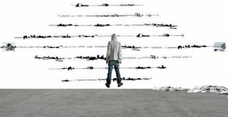 | BOTTO E BRUNO - Solo Show - The young man who refuses to leave childhood From 9 March, 2013 to 14 April, 2013 Opening 9 March, 2013 from 6pm to 9pm Gianfranco BOTTO and Roberta BRUNO were born in Turin in 1963 and 1966 respectively. Their work deals with the urban environment, focusing especially on the suburbs and abandoned industrial areas. BOTTO E BRUNO prove their talent by the diversity of their work including, photography, drawing, collage, video, and music and their excellent achievements. They have had notable exhibitions in many institutions including The Foundation Teseco for art in Pisa, the BF 15 in Lyon and Geneva Mamco. For the upcoming exhibition, Gallery Magda Danysz gives an overwhelming amount of support to this artistic duo. Upon entering the gallery the audience is automatically confronted with the environment of the artists whereby the external world dissolves. The audience is faced with a pair of used sneakers with twirls of writing emerging from the sneakers. The motif of text in their work highlights the importance of words in their creations. BOTTO E BRUNO line the walls with multiple sheets made from crumpled paper painted in black ink. They sketch a landscape that is rooted in the city - we recognize the silhouette of tall buildings – yet their sketches are extremely fragile due to the lightness of the mediums that they use. BOTTO E BRUNO juxtapose collage, paint, newspaper, songs and pictures to compile their work. The exchange between the different techniques disappears completely upon the completing of the image and the boundary between urban space and nature takes possession the piece. Combining the text, images and photographs, BOTTO E BRUNO suggest their own experience of the city. They are proposing to us to look at the image from a point of view perspective. The installation explores the process one goes through to follow dive in the understanding of the images from this new environment. | ||||
