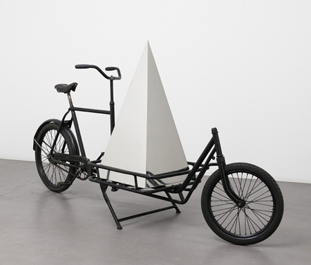 In the new series A Stationary Metamorphosis Within a Geometric Figure (pyramid) Jonathan Monk explores notions of spectatorship and object-hood through the juxtaposition of vintage bicycle and a closed geometric figure. Employing the same tongue in cheek approach to art history as several of Monk's other works the piece makes generously use of references to Duchampian imagery and the blank forms of 1960s Minimalism.
