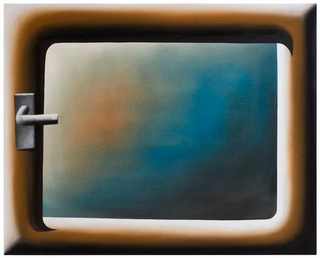 Particularly in the Baroque era, painters tested their mastery by creating trompe l'oeil tableaux, literally fooling their viewers into believing that the painting in front of them was a real, tangible mise en scene. A genre of window paintings developed from this tradition, where the frame of the painting became analogous to the frame of a window; the actual painting was supposed to represent a vista and create the same sensation as looking out of an actual window. Schulze carries forth with this tradition, reducing it to its formal essentials: frame, rendered in his typical bulbous style, and view, completely sfumato and flattened. His windows complexify the tradition of the landscape in painting history by introducing a more contemporary notion - the void. Drained of scenery, these muted vistas subvert our expectations and create, in Schulze's own words, "a feeling of yearning by means of perspective."