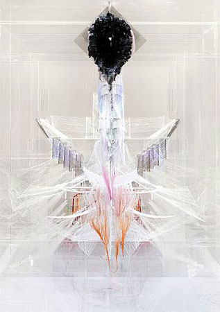 David Altmejd is known for his large humanoid figures, fashioned from plasticine or mirrors. But until a few years ago he made complex display cases of platform-style structures in which he arranged strange, seductive and grotesque objects, for example pieces of crystal and fantasy jewellery and sculpted werewolf parts. He tied these objects together with a fine golden chain, creating something like a nervous system, so that the whole sculpture looked like a living organism with energy pulsing through it. The resulting structures of plexiglass looked like abstract drawings, floating in space.